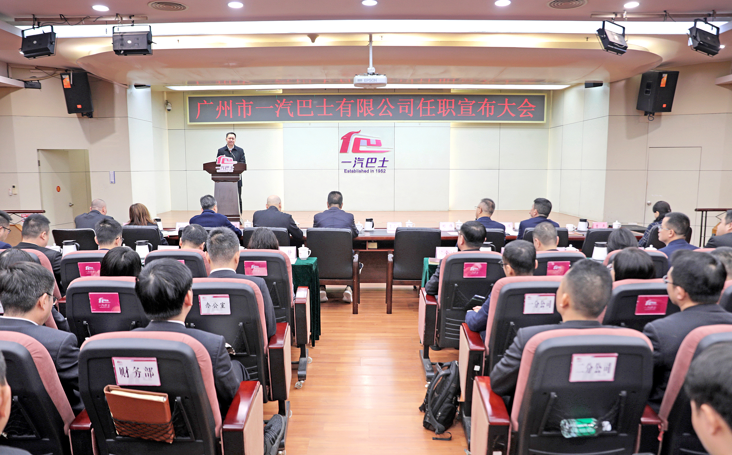 3月4日上午,公司在花港禮堂召開(kāi)任職宣布大會(huì )。廣州公交集團黨委書(shū)記、董事長(cháng)、總經(jīng)理李小軍,珍寶白馬集團董事會(huì )聯(lián)席主席范水煌,廣州公交集團副總經(jīng)理劉偉,巴士集團黨委書(shū)記、董事長(cháng)彭偉,以及公司董事、監事、經(jīng)營(yíng)班子、黨委委員和全體中層管理人員參加了會(huì )議。