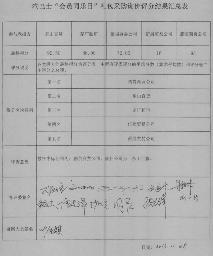 一汽巴士“會(huì )員同樂(lè )日”禮包采購詢(xún)價(jià)評分結果匯總表