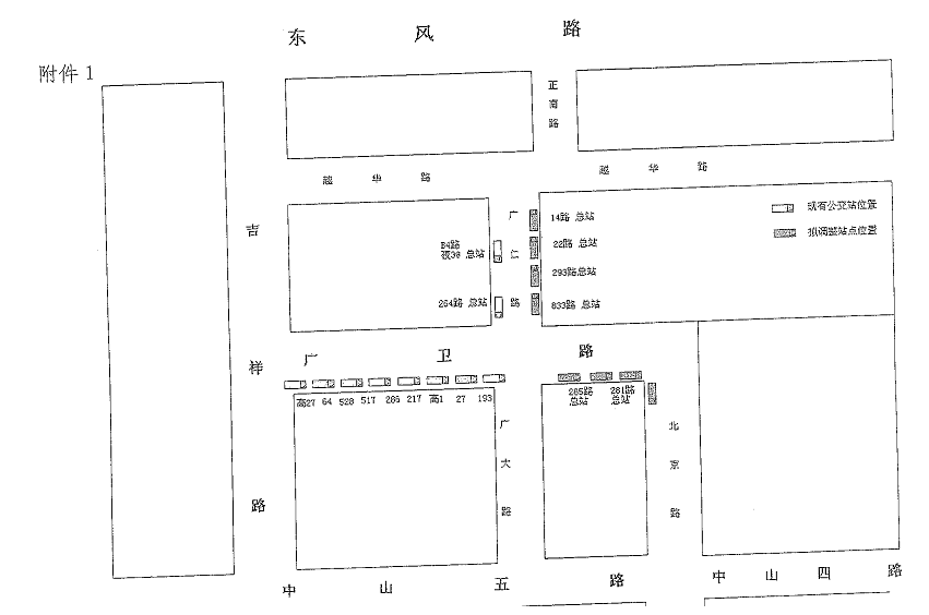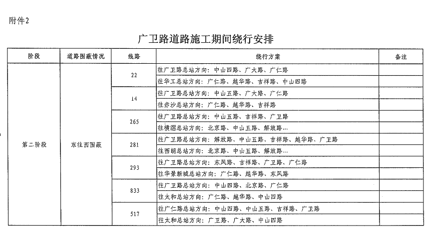 一、我公司因配合第一階段施工而調整的27路遷回原總站。第二階段施工期間,我公司原??繌V衛路北側公交總站的14路、22路臨時(shí)遷移至廣仁路(見(jiàn)附件1)。施工期間各線(xiàn)繞行情況見(jiàn)附件2。
