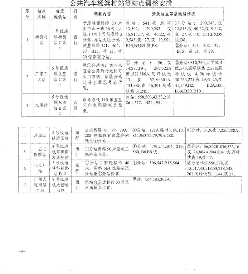 一、調整公共汽車(chē)楊箕站等7個(gè)站點(diǎn),具體調整安排詳見(jiàn)附件。