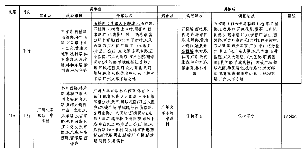 經(jīng)廣州市交通委員會(huì )批準,同意我司62線(xiàn)路由廣州火車(chē)東站總站至石槎路(步踏天下鞋城)總站調整為廣州火車(chē)東站總站至石槎路(白云世界鞋都)總站;我司62、62A路往廣州火車(chē)東站方向由行經(jīng)黃埔大道、冼村路、體育東路等路段調整為行經(jīng)黃埔大道、華夏路、金穗路、冼村路、體育東路等路段,線(xiàn)路調整后具體行經(jīng)路段、??空军c(diǎn)、營(yíng)運服務(wù)時(shí)間等見(jiàn)附件。