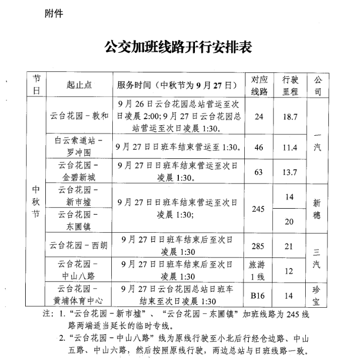接客管處通知,為做好2015年中秋節(9月27日)期間市民前往白云山登高的公交服務(wù)保障工作,經(jīng)研究,決定開(kāi)設“云臺花園-墩和”等3條公交夜間加班線(xiàn)路?,F將有關(guān)事項通知如下: