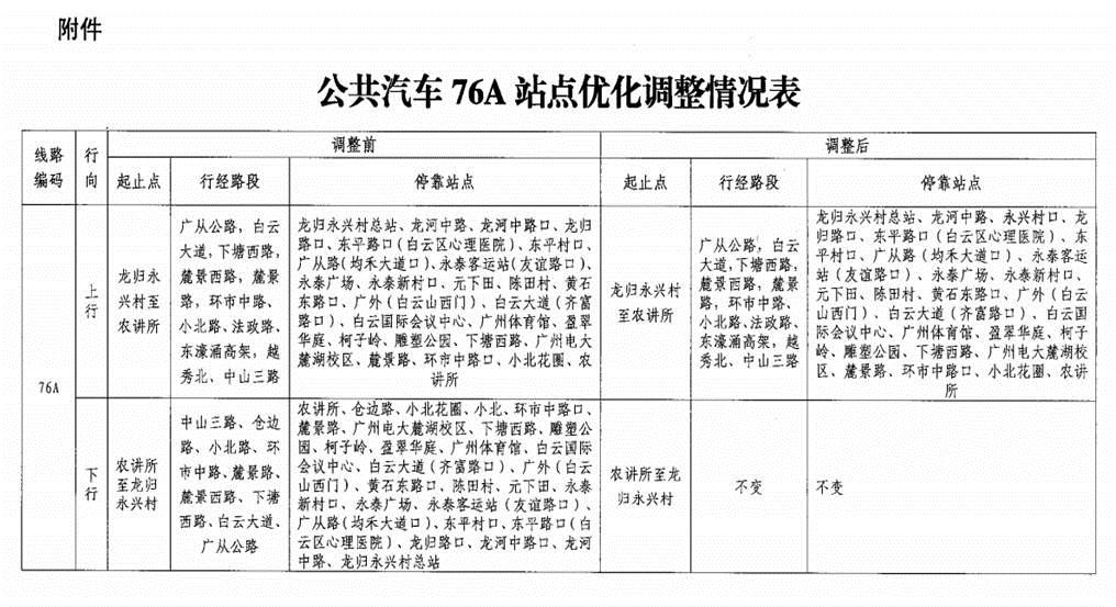 經(jīng)廣州市交通委員會(huì )批準,同意我司76A路線(xiàn)往農講所總站方向撤銷(xiāo)??抗财?chē)龍河中路口站,增加??抗财?chē)永興村口站(南行)。