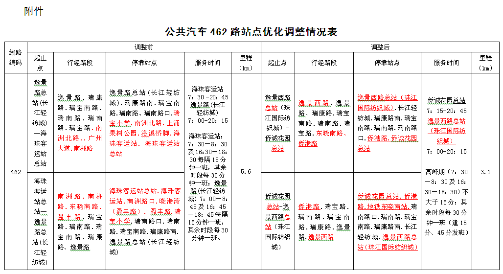一、公共汽車(chē)462路由逸景路長(cháng)江輕紡城總站至海珠客運站總站調整為逸景路西(珠江國際紡織城)總站至僑誠花園總站,調整后線(xiàn)路具體行經(jīng)路段、??空军c(diǎn)等詳見(jiàn)附件。