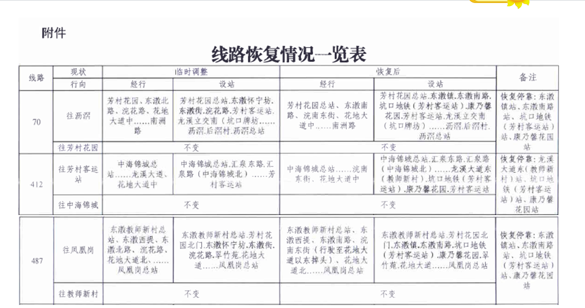 一、公共汽車(chē)70、412、487路恢復雙向行徑浣南東街路段,雙向恢復??抗财?chē)地鐵坑口(芳村客運站)站等站點(diǎn),具體恢復詳情見(jiàn)附件。